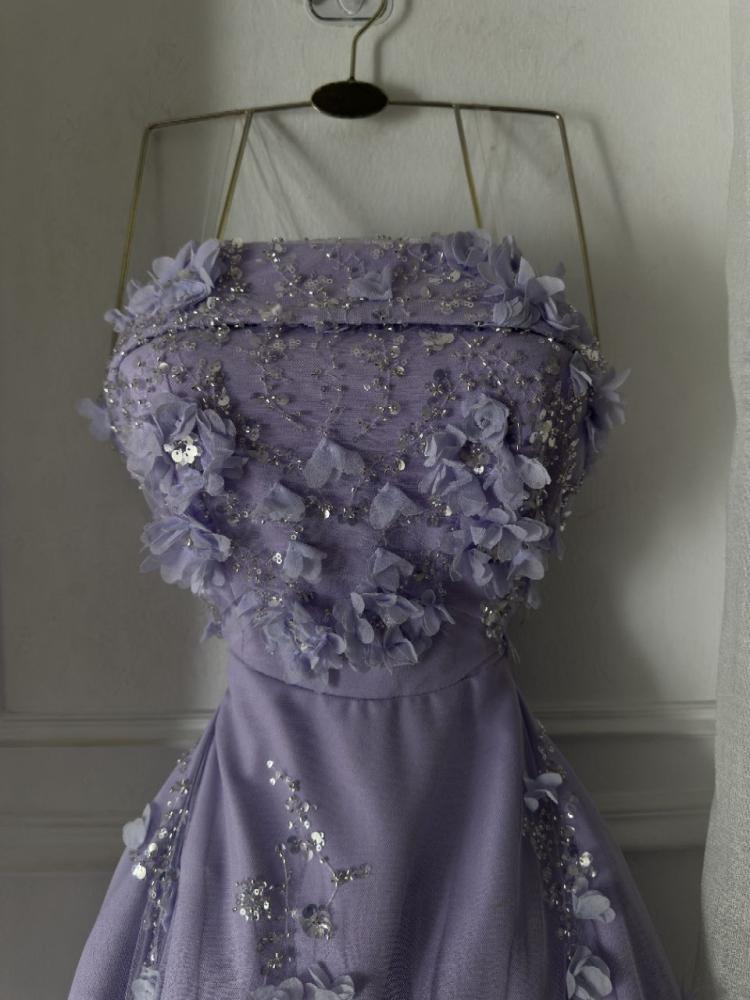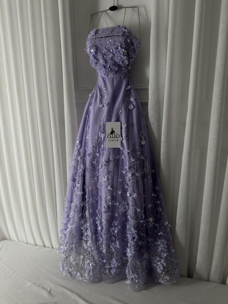 فستان سهرة فاخر بتصميم دبل كلوش واسع، مصنوع من تل مطرّز بالخرز بتفاصيل جذابة، مع ورود بارزة تضيف فخامة ببريق الترتر اللامع.