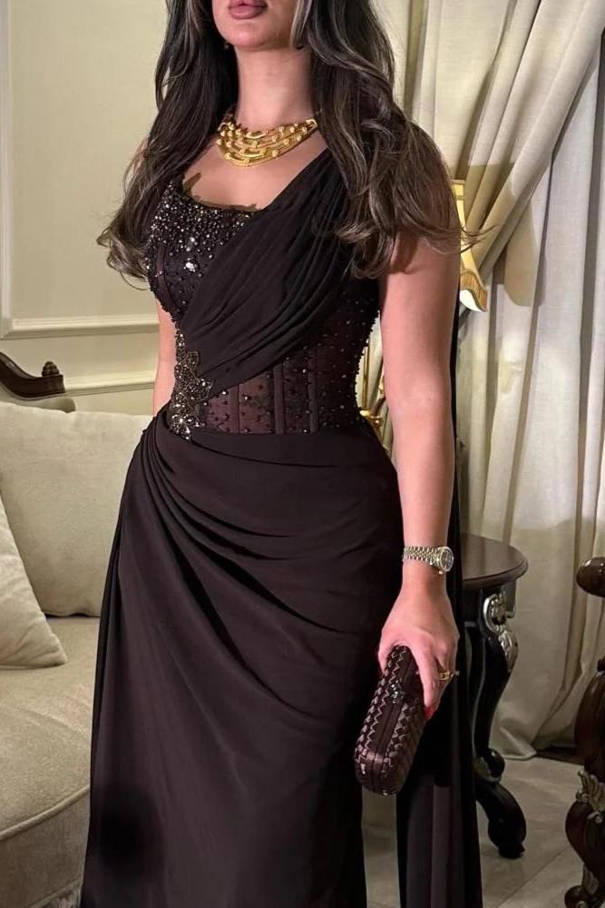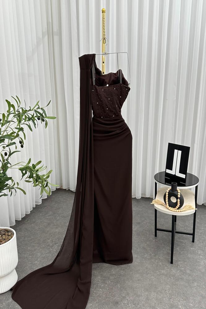 فستان سهره بكم واحد مزين بالخرز لون بني داكن
